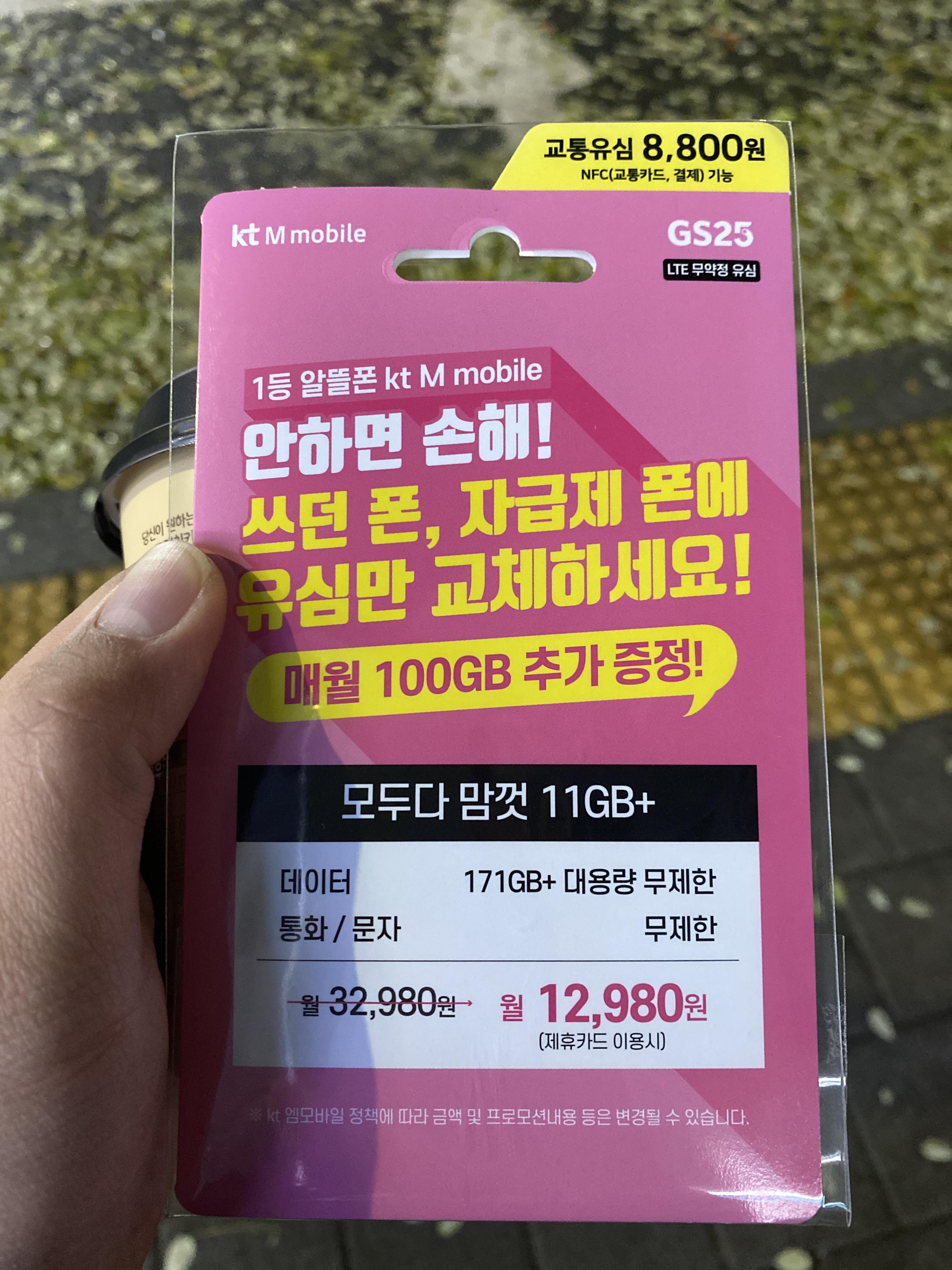 그럼, 이제 셀프개통을 해보겠습니다. 셀프개통을 할 때는 KT M 모바일 유심 배송 요청을 할 수도 있고, 근처 편의점에서 구매도 가능합니다. 저는 다행히 집에서 3분 거리에 GS 편의점이 있어서 위의 사진과 같이 바로 유심을 사다왔습니다.