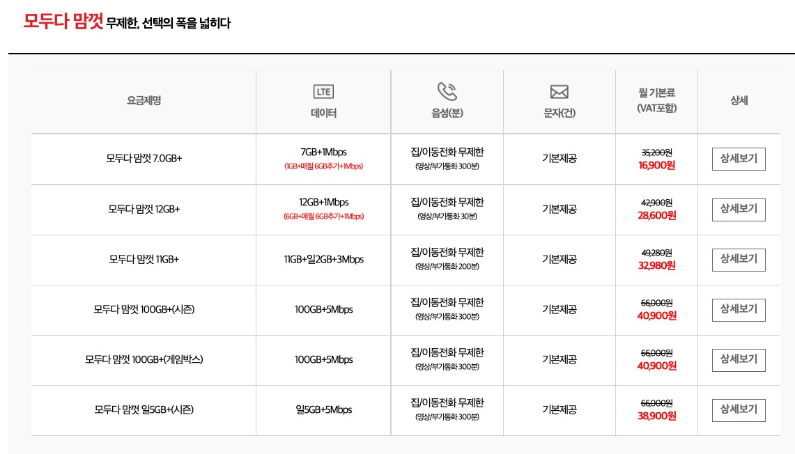 위의 사진말고도 저가요금제부터 인기요금제까지 다양하게 있는 것을 볼 수 있습니다.