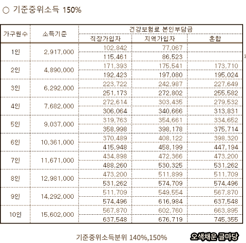 기준중위소득 110%와 100%의 건강보험료 본인부담금 액수와 소득기준입니다. 일반적으로는 하위소득 50%로 판정하고 있는 것이 바로 중위소득 100%입니다.