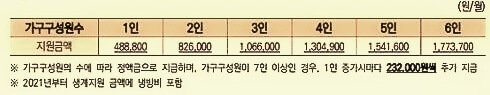 | 생계지원 | 약130만원(4인기준/월) | 최대6개월(기본3개월) |