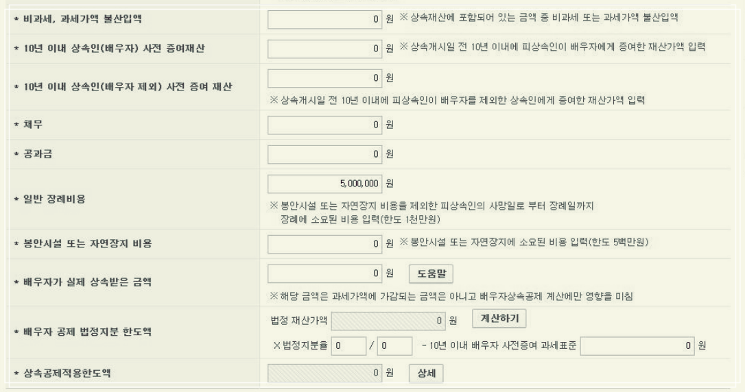 먼저 상속개시일자와 배우자 및 자녀, 연로자 및 미성년자 인적사항 등 충족되는 내용을 입력하고 부동산가액, 장애인공제액, 금융재산가액, 보험금, 퇴직금, 신탁재산, 기타재산가액 등 여러분에게 해당되는 액수를 적어줍니다.